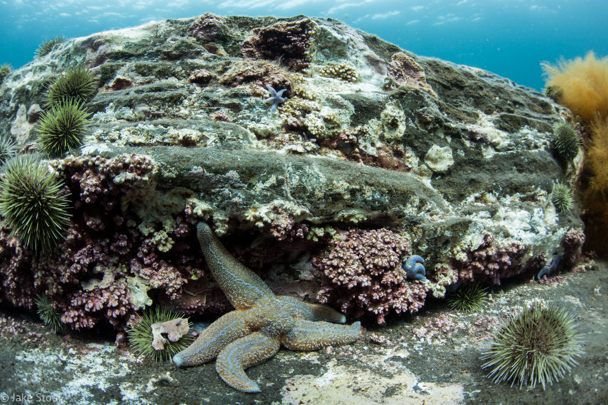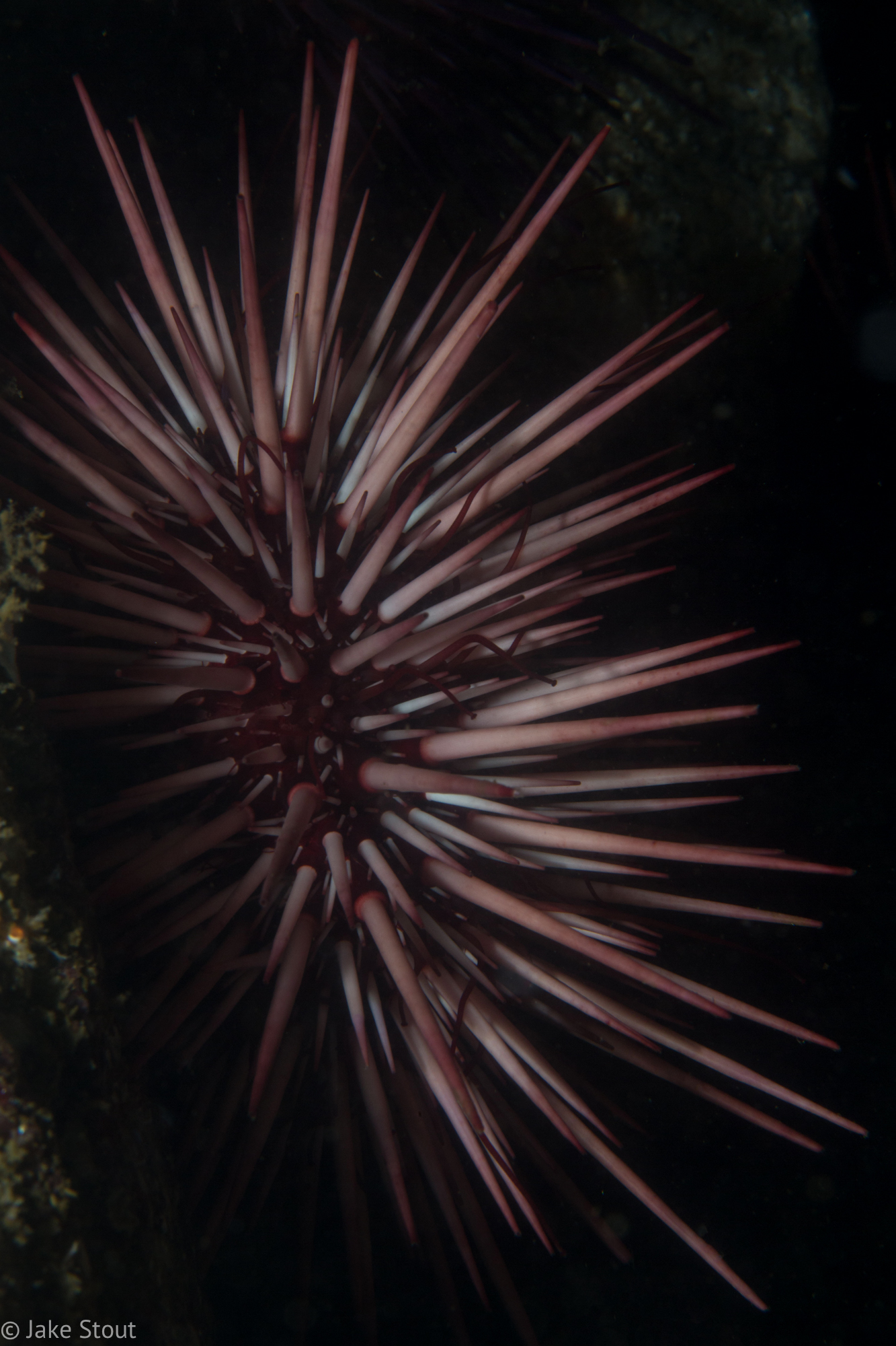 I started out by going along the wall looking at all the scarlet psoluses, bat stars, and anemones. The wall is pretty easy to navigate just, follow the rock sand line down and back. The kelp along the wall was really impressive. It reached the surface then spread out along it. I thought it would be really hard to navigate through all the kelp and that I would get tangled up a lot but it was easy to swim through and around. I would photograph the different crabs and fish swimming by me. At one point I was photographing an anemone and realized that there was a pretty big cabazon right next to me. The cabazon is a really well camouflaged fish that has almost a green army camo look to it. I got some shots of it and let it be. Probably my favorite subjects were the anemones that look like something out of Alice in Wonderland. They were massive compared to the anemones here in New England. On one dive I dropped down and noticed a purple striped jelly right in front of me. It was amazingly beautiful with bright colors against the dark green of the sea. I snapped a few shots of it and kept on going.