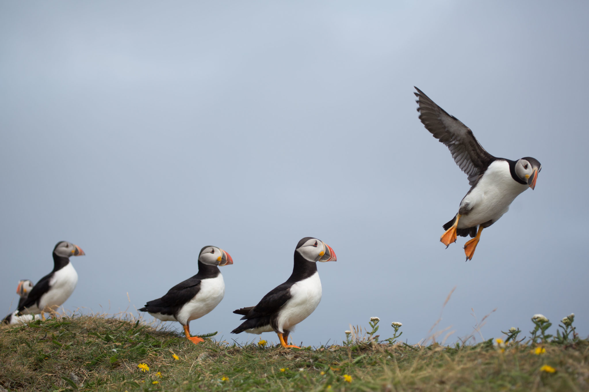 Later that day we drove up the coast to go see the puffins. Puffins are on of those animals like the ocean pout, lumpfish, and lion’s mane, that I have always wanted to see. I had such good luck with seeing all the others that I had a good feeling about visiting the puffins. When we arrived and walked over the the small peninsula that they sat on they were not only there and flying around but they were walking around next to people. I couldn’t believe it. I started firing off shots everywhere. It was really fantastic to see the cute little puffins that look a little like small sad clowns. Once I got a few good shots I sat back and observed them looking at their patterns and habits. After a few more minutes I started shooting again and got even better shots. I really couldn’t have asked for a better last day in Newfoundland.