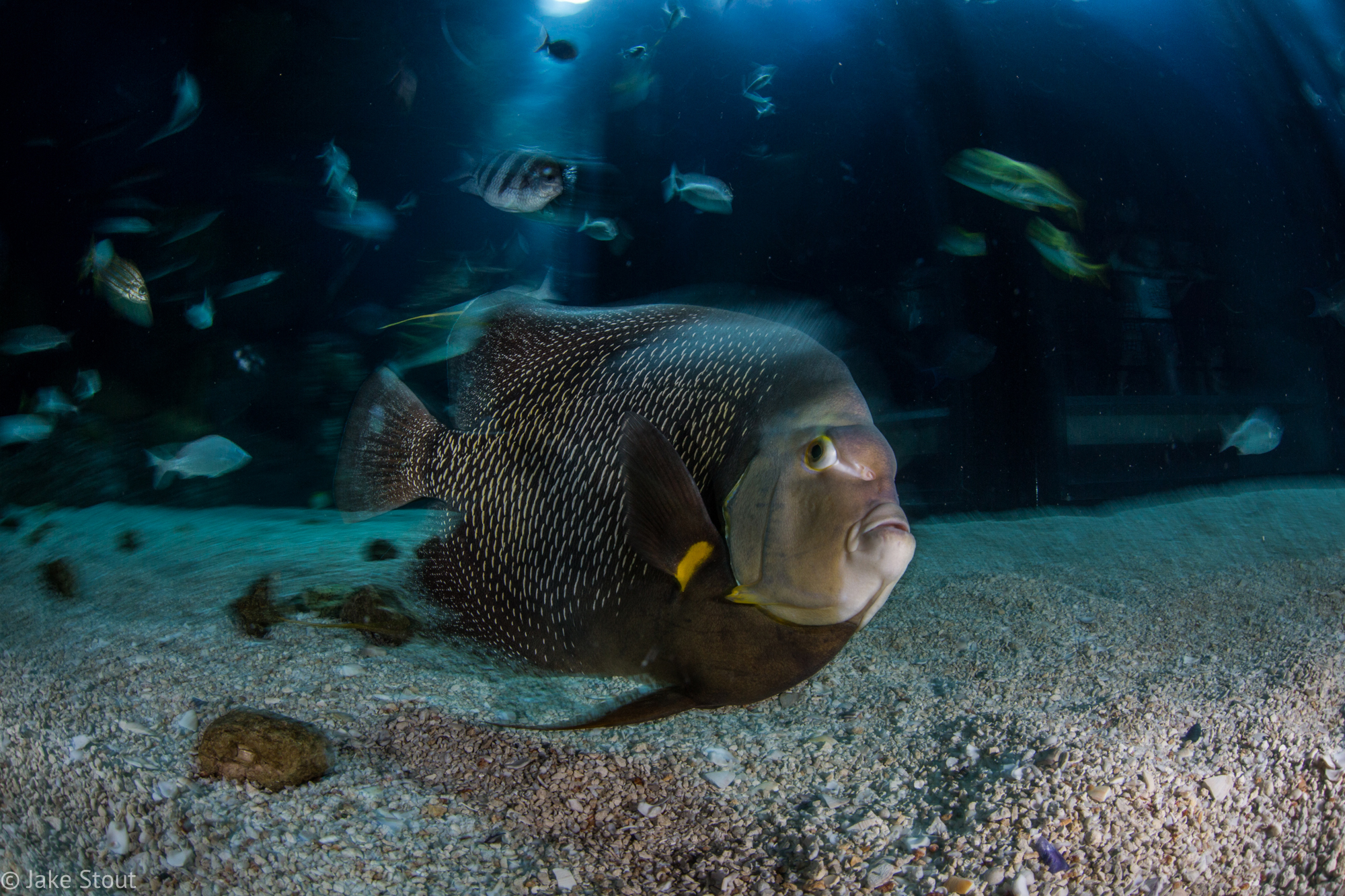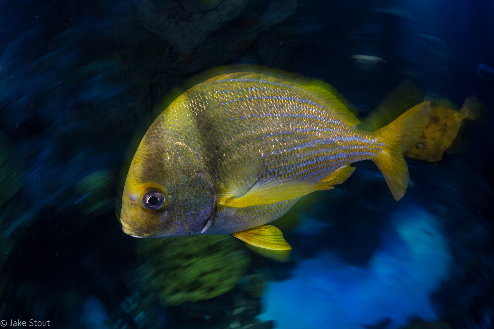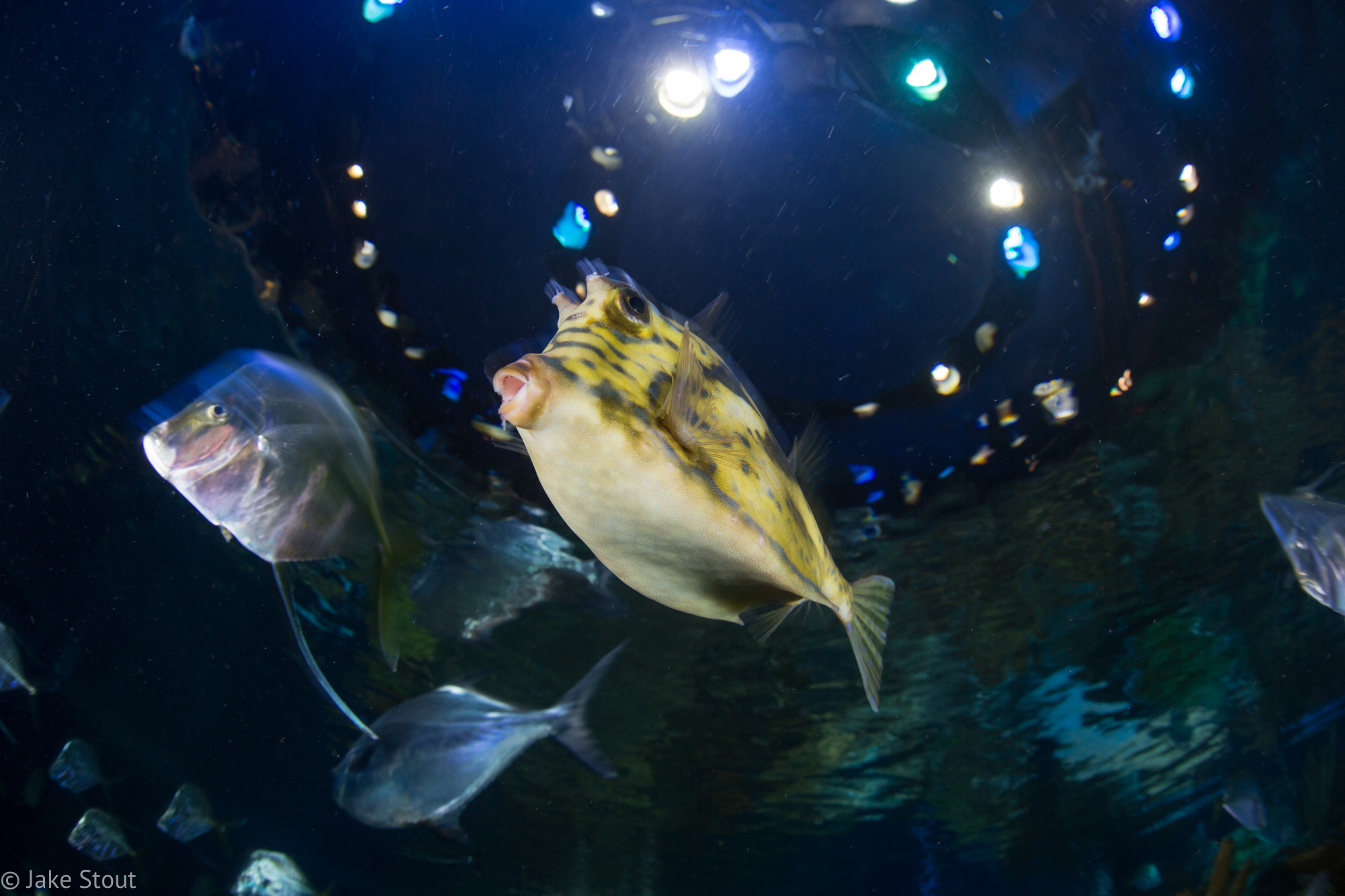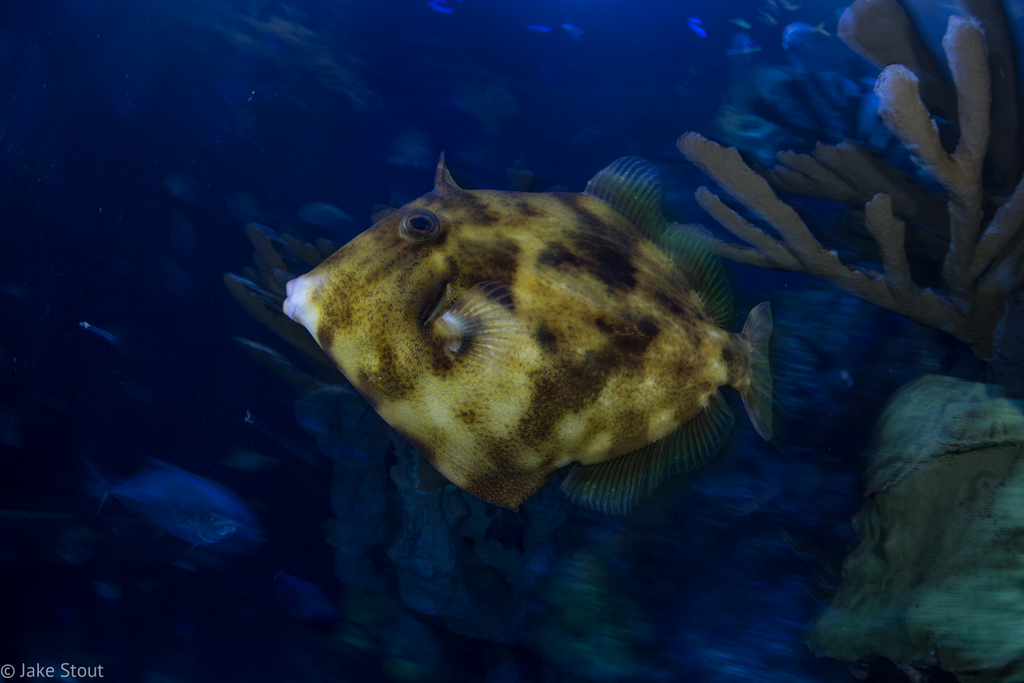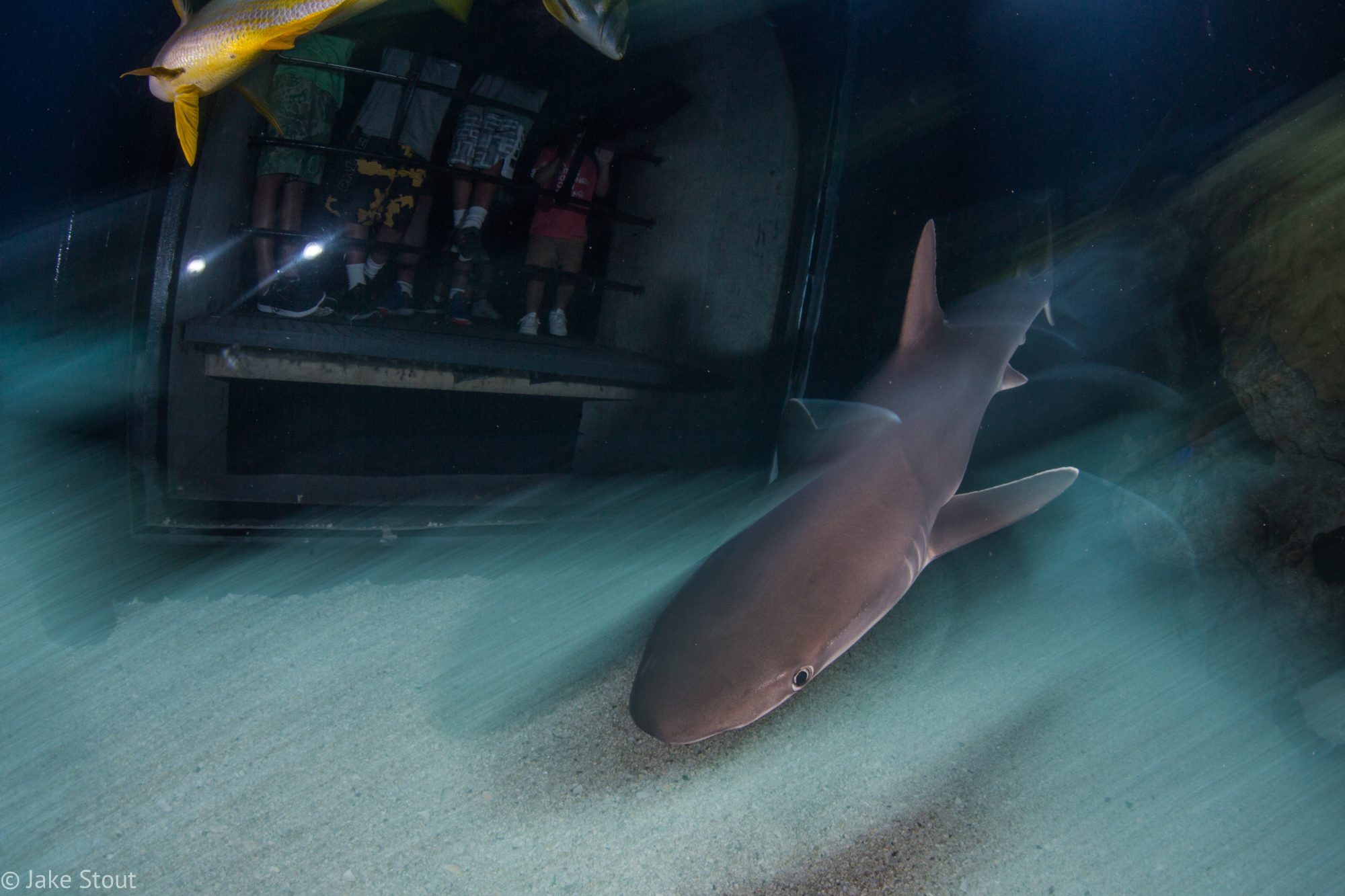 My first photography dive in the tank took place after lunch. I went in with the volunteer divers. As they cleaned I photographed the multitude of fish. One challenge photographically was that the inside of the tank was pretty bare and didn’t have much background to it. I was forced to come up with some way to make the photos interesting. I decided to shoot everything with a slow shutter speed. This way I made interesting shots and wouldn’t have to worry as much about the background. I was even greeted by Felix the resident green moray eel, who is usually hiding. One of the harder subjects to photograph was the tarpon. It’s basically like photographing a mirror with bright lights. The tarpon was intrigued by me because of the massive shiny camera and it thought I was going to give him food. I would sit in one spot wait for the tarpon to come by swim around me then I would get a few shots. Most shots weren’t that great but I got a few good ones. Another favorite subject for me was the many blue tangs and doctor fish feeding on the lettuce. I could get as close as I wanted to them and they wouldn’t be afraid of me. By the end of the day I got some pretty nice shots and had an amazing time in the aquarium.