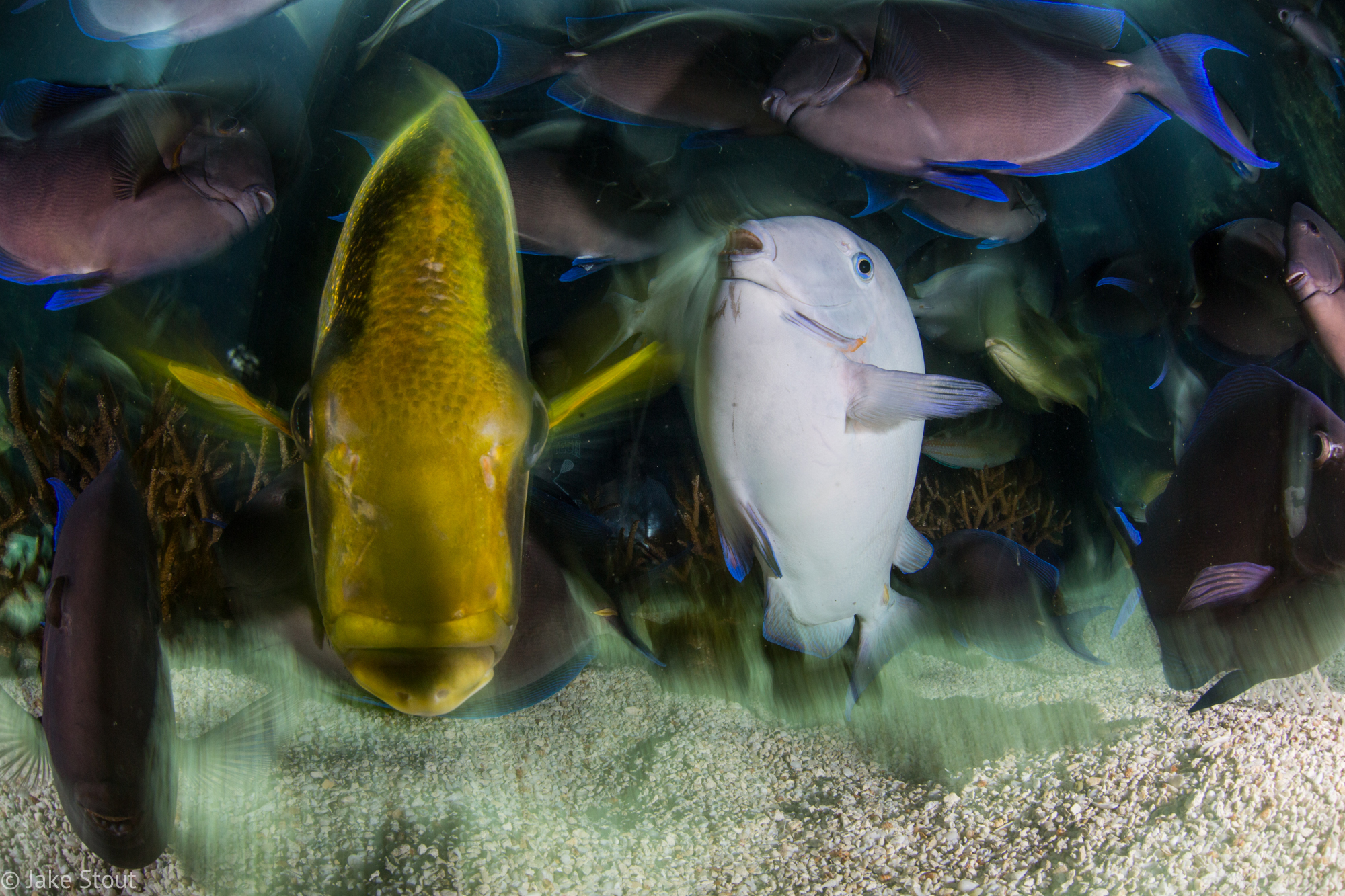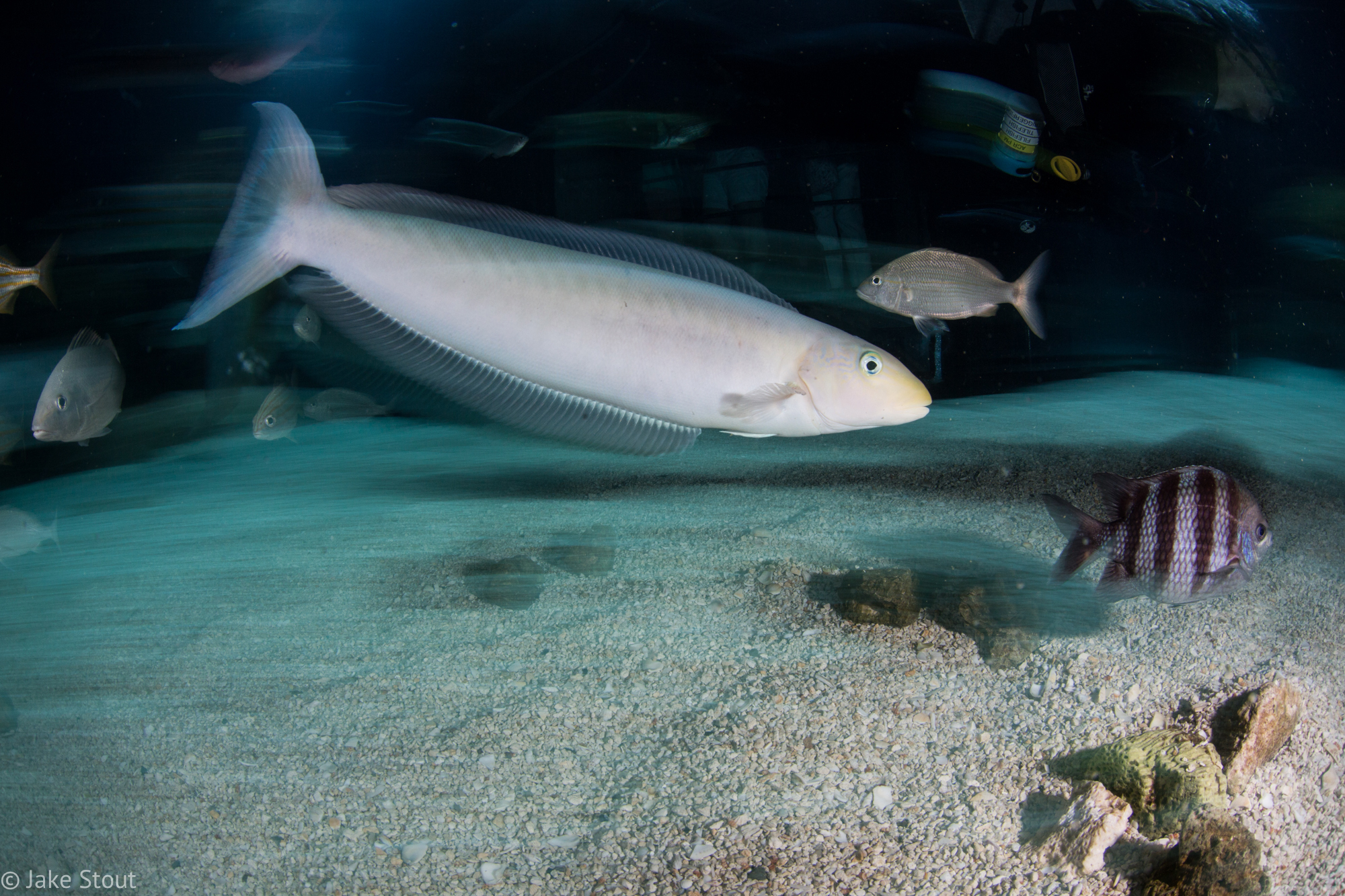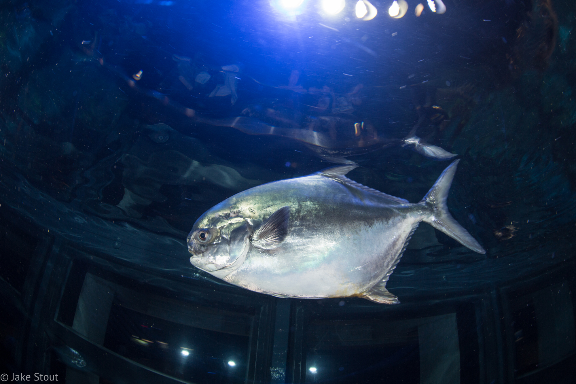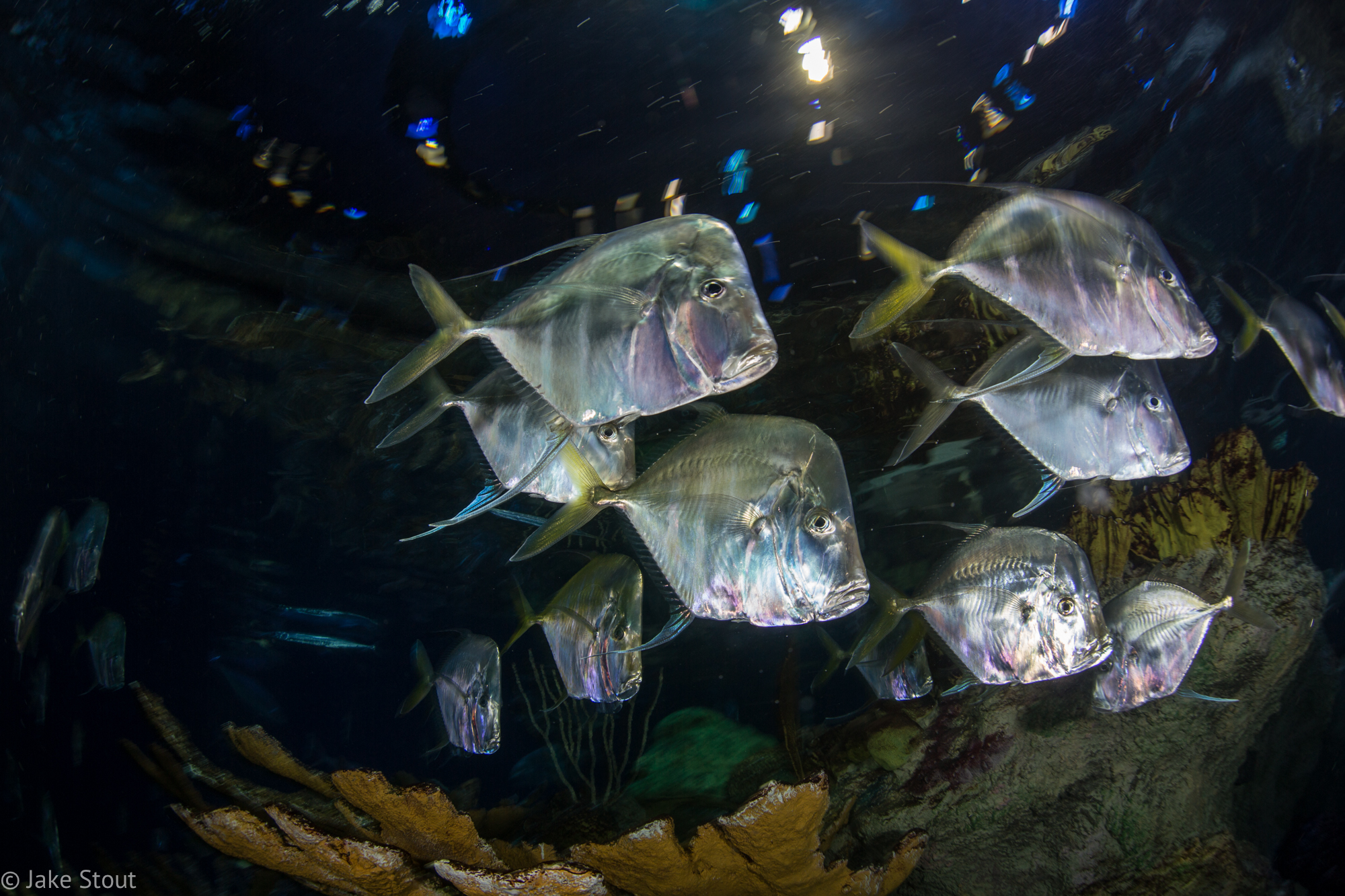 My first photography dive in the tank took place after lunch. I went in with the volunteer divers. As they cleaned I photographed the multitude of fish. One challenge photographically was that the inside of the tank was pretty bare and didn’t have much background to it. I was forced to come up with some way to make the photos interesting. I decided to shoot everything with a slow shutter speed. This way I made interesting shots and wouldn’t have to worry as much about the background. I was even greeted by Felix the resident green moray eel, who is usually hiding. One of the harder subjects to photograph was the tarpon. It’s basically like photographing a mirror with bright lights. The tarpon was intrigued by me because of the massive shiny camera and it thought I was going to give him food. I would sit in one spot wait for the tarpon to come by swim around me then I would get a few shots. Most shots weren’t that great but I got a few good ones. Another favorite subject for me was the many blue tangs and doctor fish feeding on the lettuce. I could get as close as I wanted to them and they wouldn’t be afraid of me. By the end of the day I got some pretty nice shots and had an amazing time in the aquarium.