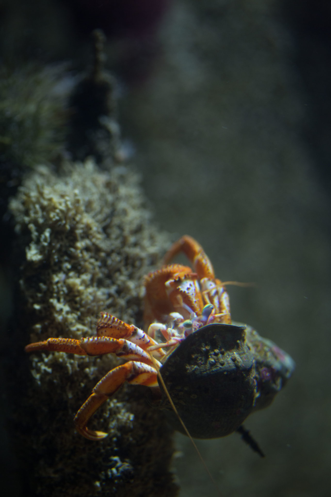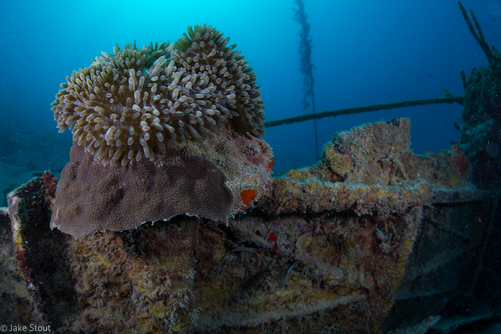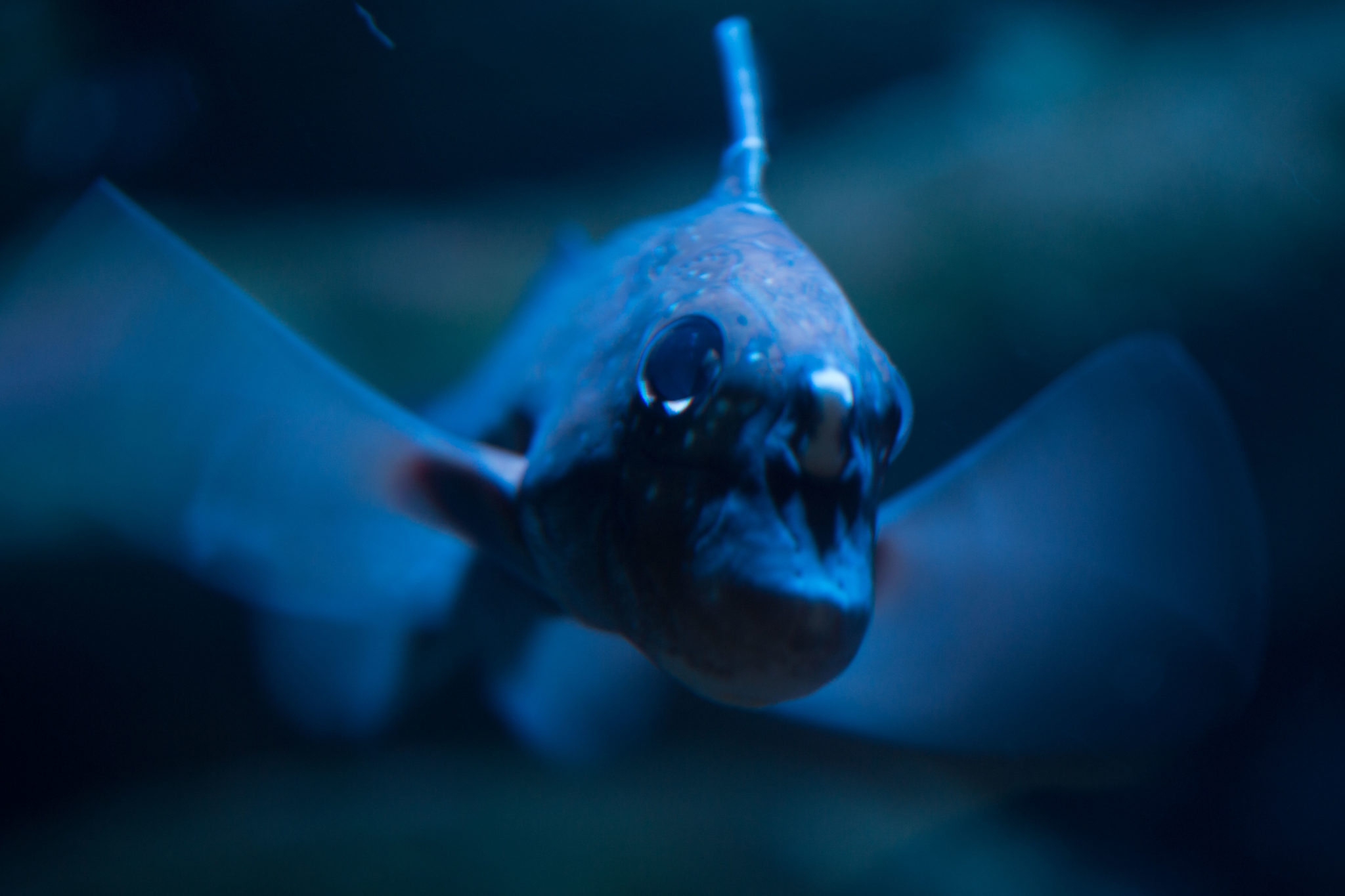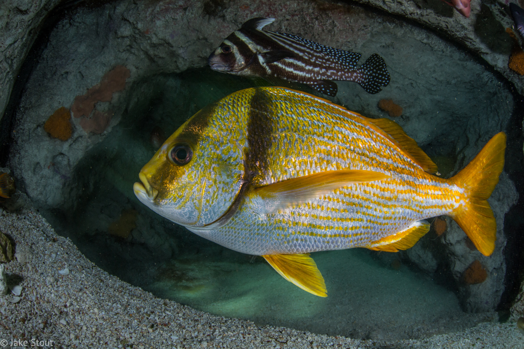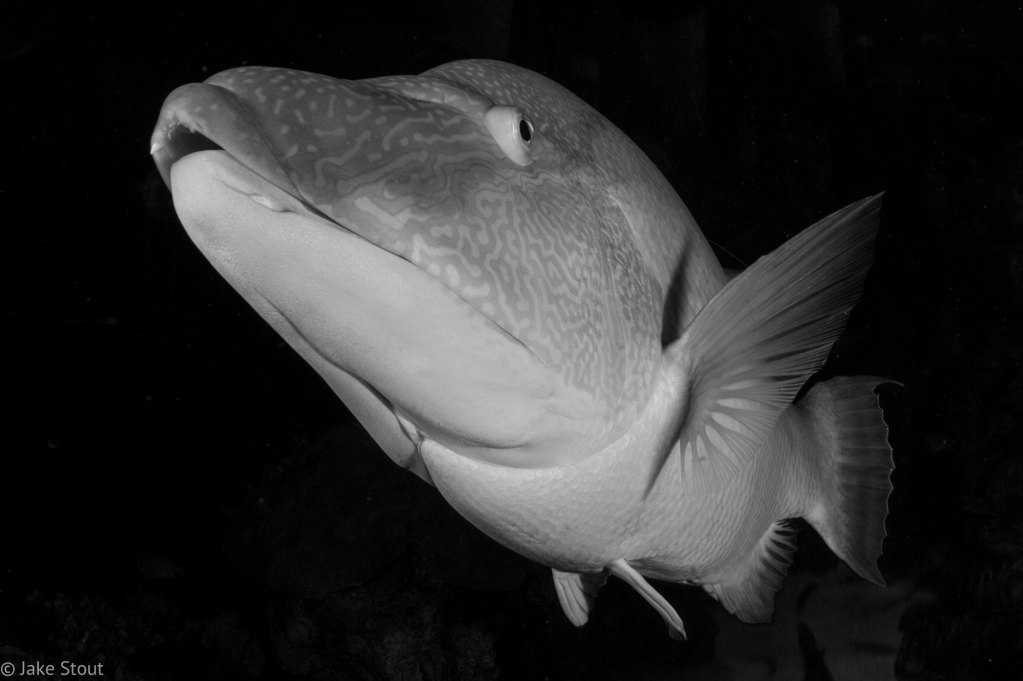My first photography dive in the tank took place after lunch. I went in with the volunteer divers. As they cleaned I photographed the multitude of fish. One challenge photographically was that the inside of the tank was pretty bare and didn’t have much background to it. I was forced to come up with some way to make the photos interesting. I decided to shoot everything with a slow shutter speed. This way I made interesting shots and wouldn’t have to worry as much about the background. I was even greeted by Felix the resident green moray eel, who is usually hiding. One of the harder subjects to photograph was the tarpon. It’s basically like photographing a mirror with bright lights. The tarpon was intrigued by me because of the massive shiny camera and it thought I was going to give him food. I would sit in one spot wait for the tarpon to come by swim around me then I would get a few shots. Most shots weren’t that great but I got a few good ones. Another favorite subject for me was the many blue tangs and doctor fish feeding on the lettuce. I could get as close as I wanted to them and they wouldn’t be afraid of me. By the end of the day I got some pretty nice shots and had an amazing time in the aquarium.