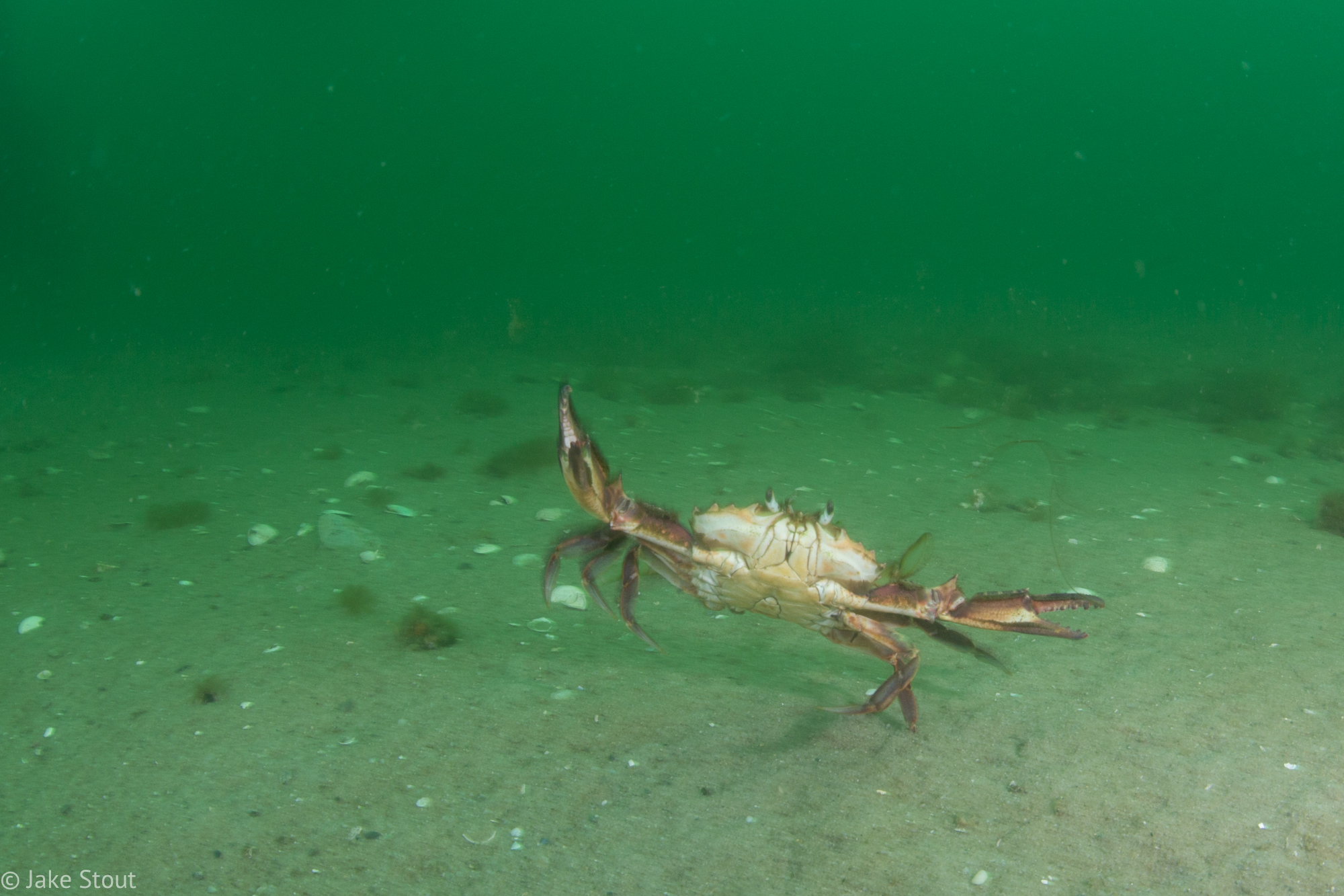 We reached our first site, half of us geared up to get in the water while the other half stayed on the boat to dive after us. A transect line had been laid down for us to follow and find our way around the proposed site. The first thing I noticed about the site was the abundance of sea robins. Quirky, odd, almost prehistoric reptile like fish, they have large pectoral fins that they spread out to swim away from something, when they’re not crawling through the sand with strange finger like appendages. I’ve always wanted to see a sea robin, and I wasn’t disappointed we saw quite a few sea robins about 10 or so total. Some would hide in the sand other would ran away from you and others would just sit in front of you. We also many spider crabs, a few lady crabs, and a patch of squid eggs. Squid eggs look like translucent torpedoes all huddled together on a rock. The site was really nice and might be a good spot for an artificial reef.