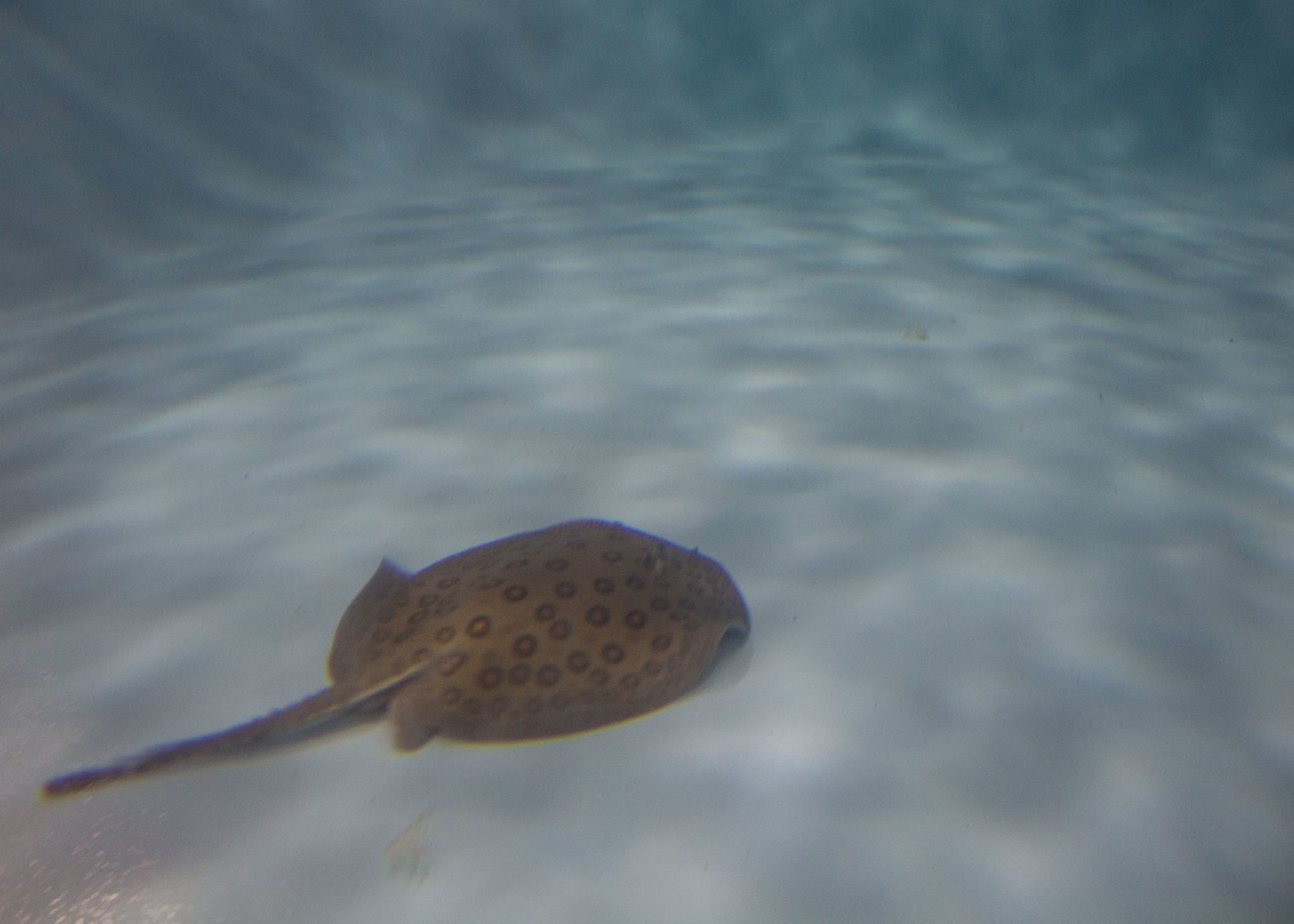 This morning Simon the stingray was overdue for a spine clipping. In the morning I worked with Katie, Emily, Jennie Janson, the assistant curator of Blue Wonders and a diver, and Josh Foronda one of Holly’s dive team. Katie and Jennie went down to catch Simon while Josh tended the divers (made sure nothing happened to them while diving), and Emily helped to cut Simon’s spine and measure and weigh him. After a few failed attempts to catch him he was finally on the platform being weighed and measured, his spine was cut so that he didn’t injure any of the many divers that come through the tank every day. Cutting a spine of a ray is pretty much like a fingernail, it grows back soon after. Simon was healthy and thrown back soon after. I of course asked if I could keep the spine since it’s such a cool souvenir!