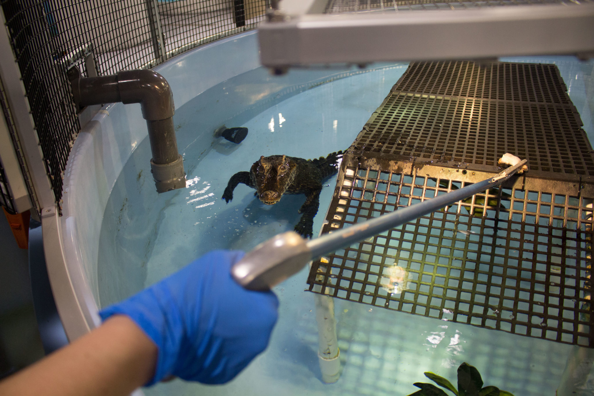 My morning started by getting food ready for the aquarium’s many animals. I cut up a crab, and stuffed squid and bait fish with vitamin pills for the sharks and rays in Black Tip Reef. I worked with Emily Anderson and Katie Diciccio, divers and aquarists who help run the Atlantic Coral Reef and Black Tip Reef. We headed down to feed the large whiptail rays and the nine black tips in the newest exhibit Black Tip Reef. To feed the rays we used a long pole and forced it in front of their face then they would sit up on it and chew the food on the end. You could feel them chewing and almost hear a crunching sound coming up the pole. After the four rays were all feed we moved on to the sharks. The exhibit has two zebra sharks, nine black tips, and a couple wobbegongs. We fed the black tips by hanging a target just above the water as sort of a training measure they would touch or go around the red buoy and be fed. Instead of the target feeding of the rays this was a broadcast feeding of all the black tips at once. It was at times a mass frenzy throwing squid and fish parts near their faces.